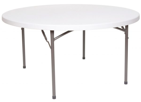 Round tables provide a better use of space for smaller areas and generate less crowding when guests sit down. The round design allows endless setup patterns. Our 60″ white round tables are perfect for outdoor and indoor use. The table can be covered with a decorative tablecloth or used as is. Our tables always come clean and stain-free. The durable plastic surface makes cleanup a breeze. This table comfortably seats up to 8 adults and allows guests to face one another, creating the perfect scenario for mingling. The 60″ round table has folding legs so set up and take down is quick and easy.
